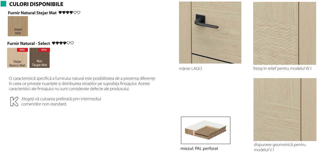 Miezul ușii este format dintr-o inserţie de stabilizare consolidată cu ramă din placaj. Miezul ușii din PAL perforat reprezintă cost suplimentar. Pregătire pentru scurtare maxim 60 mm. Înălţimea „220” (modelele V.1, V.2, V.3 cu și fără inserţii) include o umplutură din PAL perforat și trei balamale.